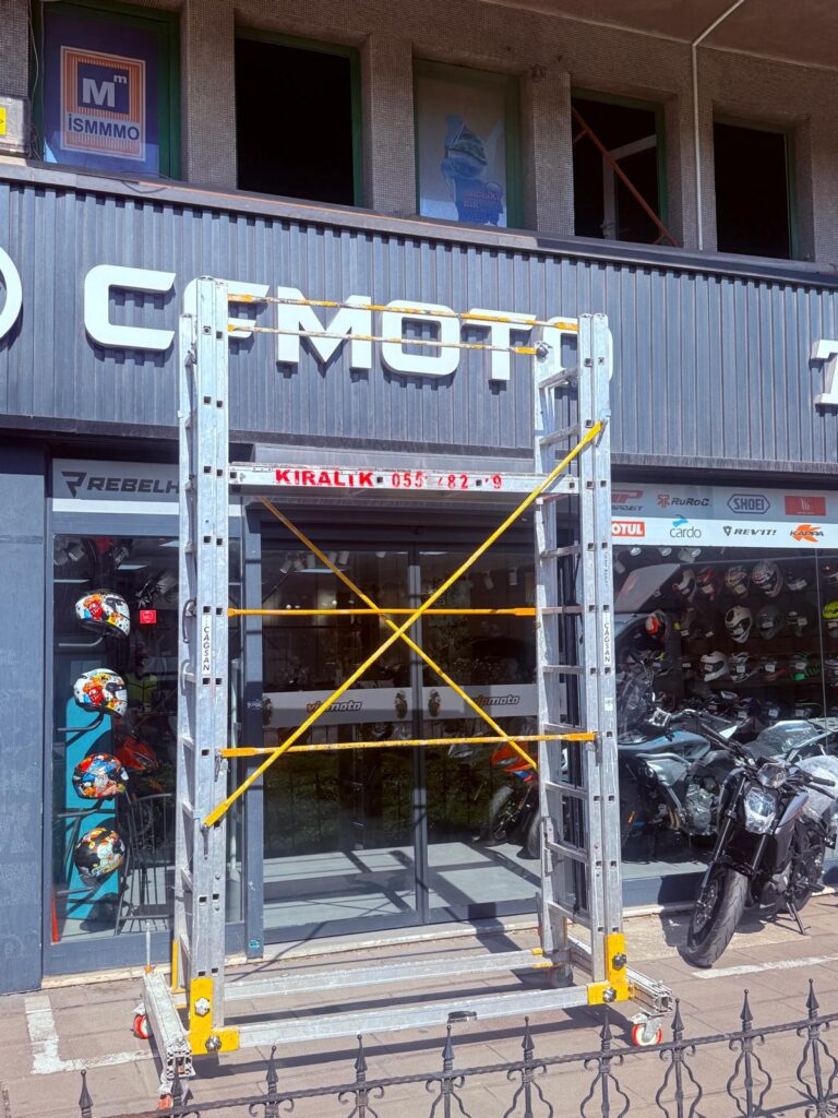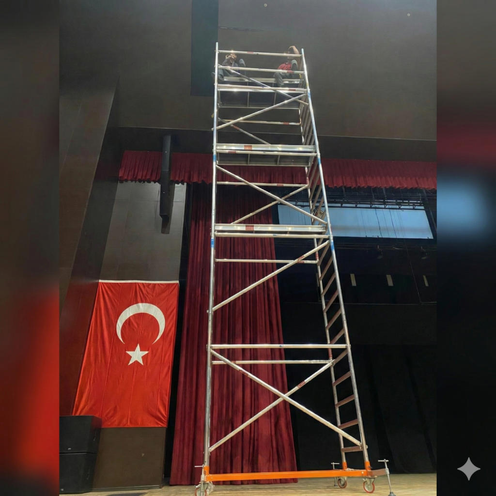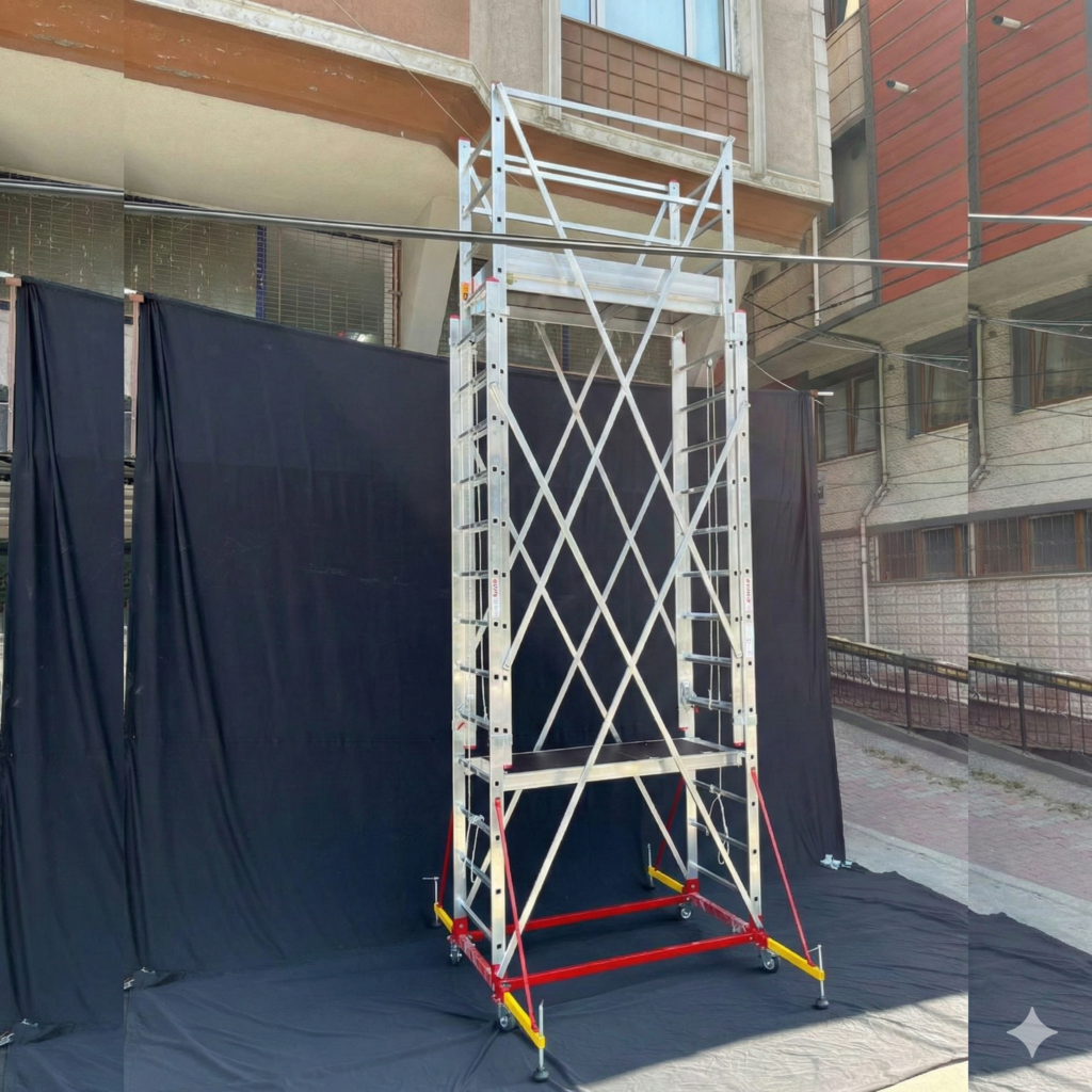 2–4–6–8–10 metre seçeneklerine sahip Mobil İskele sistemimiz, işin yüksekliğine göre esnek kullanım sunarak farklı projelere hızlıca uyum sağlar. Modüler yapısı sayesinde ihtiyaç duyulan seviyeye kolayca yükseltilir; iç mekân çalışmaları, dış cephe uygulamaları ve şantiye ortamlarında güvenli bir çalışma alanı oluşturur.